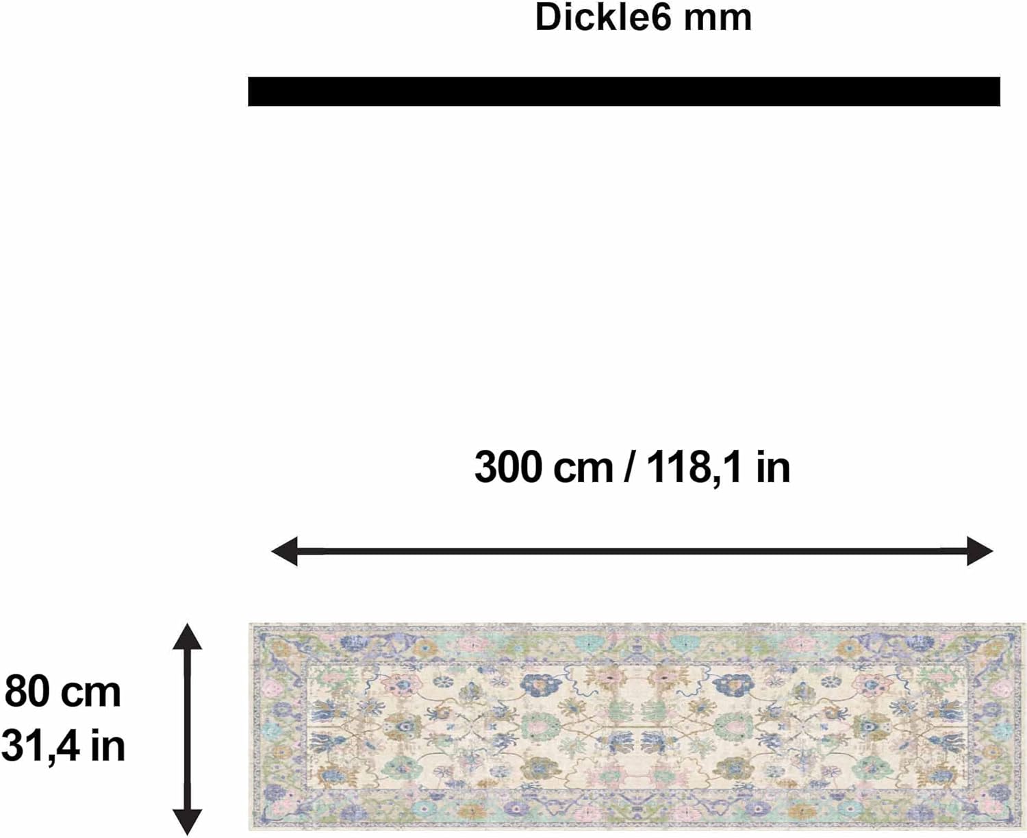 Maschinell gefertigter Teppich mit Chenille-Druck: Dieser Teppichläufer für den Flur ist ein maschinell bedruckter Chenille-Teppich, der auf jedem Untergrund verwendet werden kann und leicht zu reinigen ist. Die Oberseite des Teppichläufers besteht aus Chenille, die Unterseite aus 100 % Baumwolle.